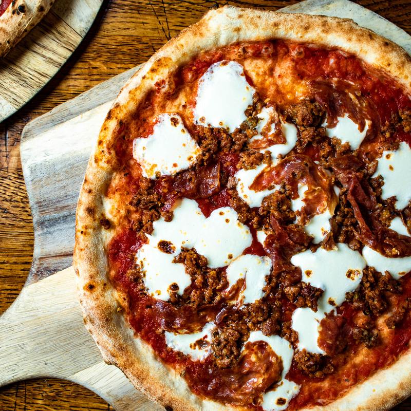The Pancetta Pizza is a gourmet blend of sweet and savory flavors, offering a unique and indulgent experience. It features a rich combination of fresh mozzarella and Fontina cheese, creating a creamy, smooth, and slightly nutty base. The star ingredient, pancetta, adds a savory, crispy touch with a deliciously smoky flavor. Complementing the richness are candied figs, providing a delightful sweetness that balances the saltiness of the pancetta. Peppery arugula adds a fresh, slightly spicy contrast, while a drizzle of olive oil enhances the flavors with a touch of Mediterranean elegance. This pizza is a perfect fusion of flavors that is both sophisticated and satisfying.