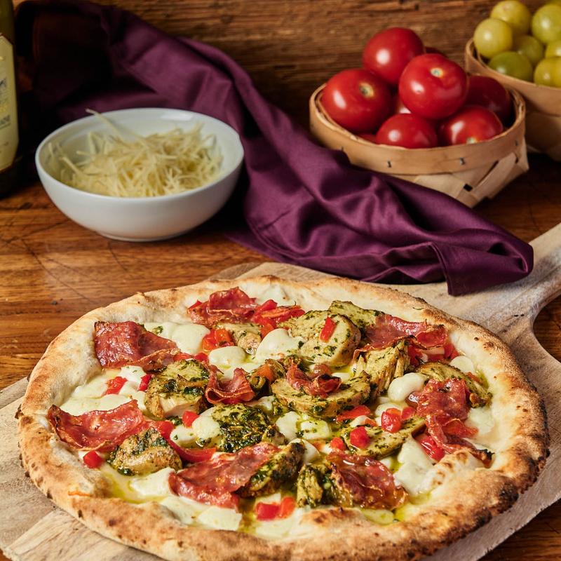 The Ultimate Pizza is a luxurious and flavorful creation that brings together a perfect blend of rich and aromatic ingredients. It features truffle oil-infused fresh mozzarella, offering a creamy texture with an indulgent earthy aroma. The pizza is topped with pesto-infused oven-roasted sliced chicken, adding a tender and herbaceous flavor that pairs beautifully with the other ingredients. Spicy soppressata (Italian pepperoni) delivers a bold kick, while Juanita peppers provide a touch of heat and sweetness. Pancetta (Italian bacon) contributes a savory, crispy texture, complemented by the creamy richness of Gouda cheese. Fresh basil adds a fragrant, refreshing note, and a dash of Mama's garlic ties everything together with a burst of robust flavor. This pizza offers a perfect harmony of flavors, making it a truly irresistible experience for those who crave bold and sophisticated tastes.