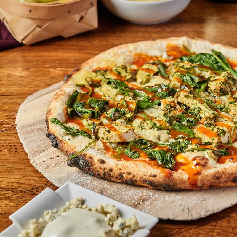 The Buffalo Chicken Pizza is a bold and flavorful creation that brings a spicy twist to a classic favorite. It starts with a zesty blend of Frank’s Hot Sauce and butter, creating a rich and fiery base that coats the pizza with a perfect balance of heat and smoothness. Crushed red pepper adds an extra kick, while tender oven-roasted chicken provides a hearty and satisfying bite. A dash of blue cheese crumble introduces a creamy, tangy contrast that enhances the spice, while aromatic garlic and fresh basil bring depth and freshness to every bite. To complete the experience, this pizza is served with a side of gorgonzola dipping sauce, offering a cool, creamy complement to the bold flavors. Perfect for spice lovers, this pizza delivers a mouthwatering combination of heat, richness, and indulgence.